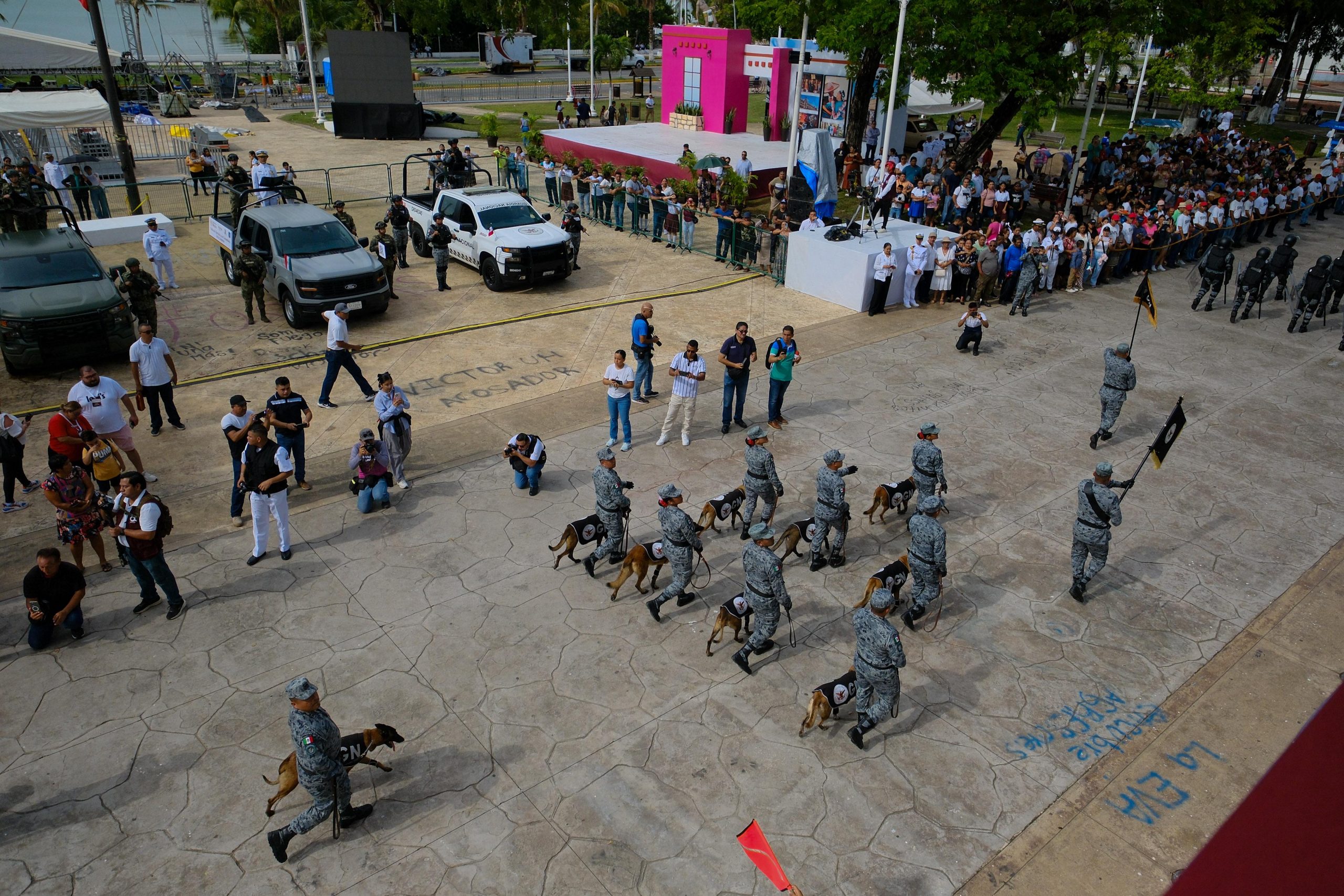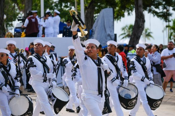 Por su parte el Comandante de Columna del Desfile, Capitán de Fragata C.G D.E.M Eleazar Varela Yáñez de la Secretaría de Marina Armada de México, informó que participaron 48 bandas de guerra con 54 banderas, 443 integrantes de los tres órdenes de fuerza de seguridad, armadas y Guardia Nacional; 120 de la Secretaría de Seguridad Ciudadana; 22 vehículos, 6 embarcaciones, 15 canes, haciendo un total de 5 mil 935 efectivos, sin novedad.