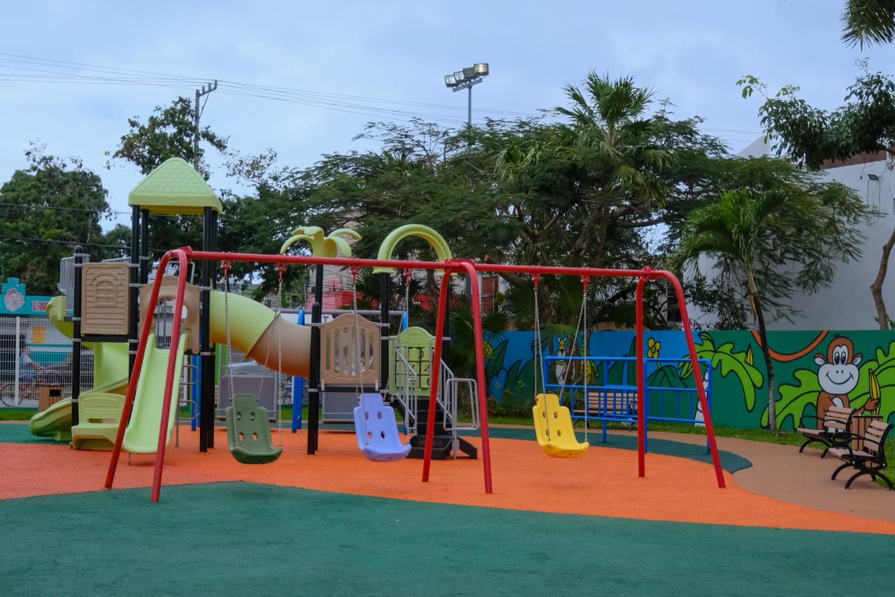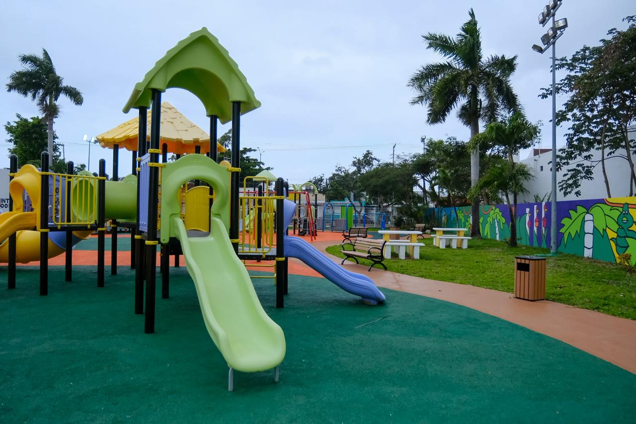 La rehabilitación incluyó el cambio de 600 metros cuadrados de piso de caucho en el área de juegos, renovación del pasto en áreas verdes, instalación de juegos inclusivos, acondicionamiento del área de picnic, rehabilitación de baños, trabajos de pintura, colocación de bancas y botes de basura, creando un entorno seguro, digno e incluyente para niñas, niños, adolescentes y familias cozumeleñas.