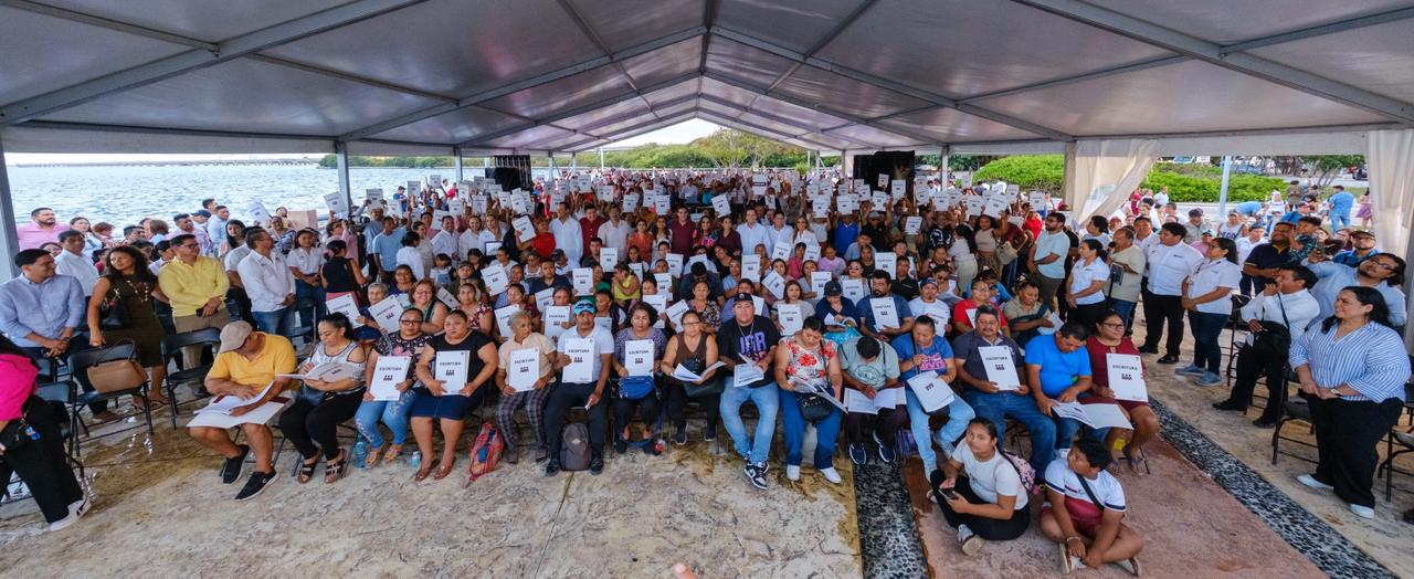 La entrega se realizó en la explanada del Malecón Tajamar, en donde la Gobernadora destacó que la mejor manera de celebrar 56 años de Cancún es haciendo justicia social, en un evento con el pueblo, con la familia que esperaron largos años para tener los papeles que les dan certeza jurídica sobre su propiedad.