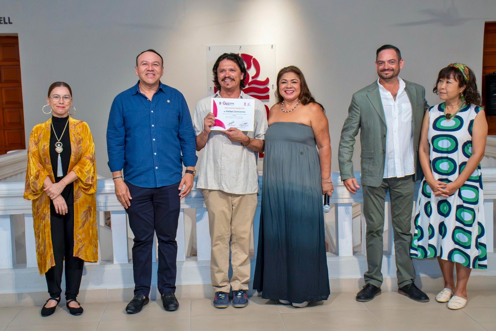 Ante el público cozumeleño, que busca nuevas expresiones artísticas, el consejero de la institución, Alejandro Queb Franco, entregó un reconocimiento al artista por su trayectoria y aportación cultural, acompañado de Christian Köhl Graf, galerista y promotor de arte, fundador de Haus Der Kunst Guadalajara y Director de Amalgama Proyecta, así como de Cochu Aparicio, fundadora de la residencia rural de artistas BenAmil en el Caribe, El Cedral y la museoógrafa de Cozumel, Satoko Kitamura.