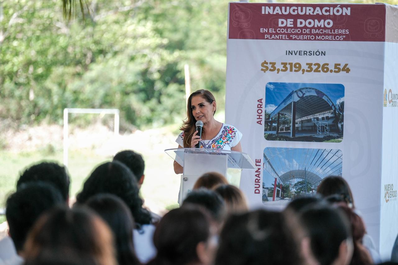 Puerto Morelos.- La gobernadora Mara Lezama Espinosa cumplió una promesa al inaugurar un domo ligero en el Colegio de Bachilleres de Puerto Morelos, obra destinada a mejorar las condiciones para las actividades deportivas, culturales y cívicas de 421 estudiantes de esta institución.