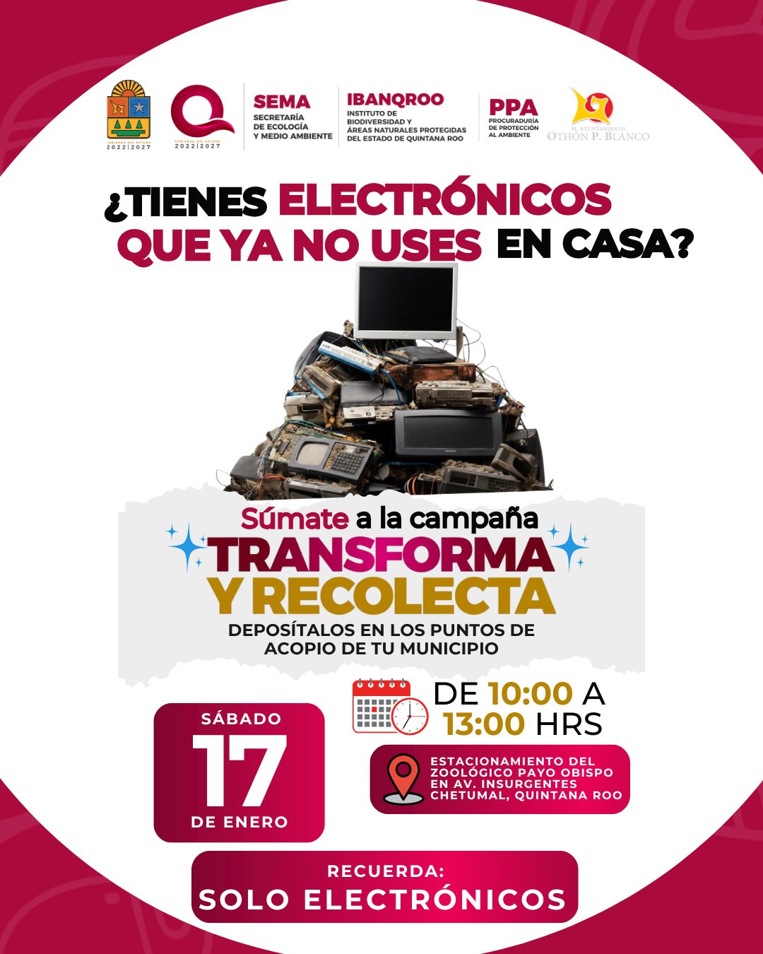 Chetumal.– El gobierno del Estado a través de la Secretaría de Ecología y Medio Ambiente (SEMA), que encabeza Óscar Rébora Aguilera, anunció para el próximo sábado 17 de enero del 2026, la recolección de aparatos electrónicos con el programa “Transforma y Recolecta”, que se realizará en Chetumal, con el objetivo de promover la gestión adecuada de residuos y minimizar su impacto en el entorno natural y la salud pública.