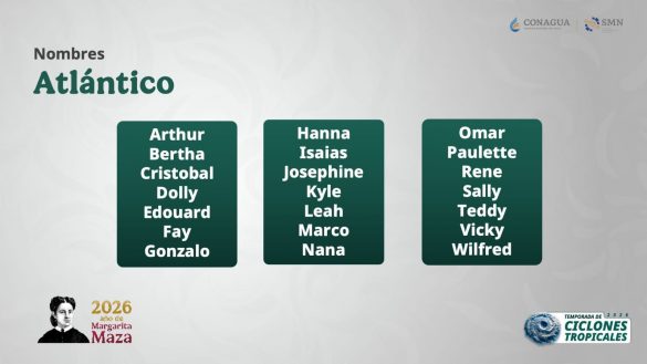 Cancún.- La Comisión Nacional del Agua (Conagua) dio a conocer el pronóstico oficial de la temporada de ciclones tropicales 2026 en el Atlántico, en la que se prevé la formación de entre 11 y 15 sistemas, informó la gobernadora Mara Lezama Espinosa.