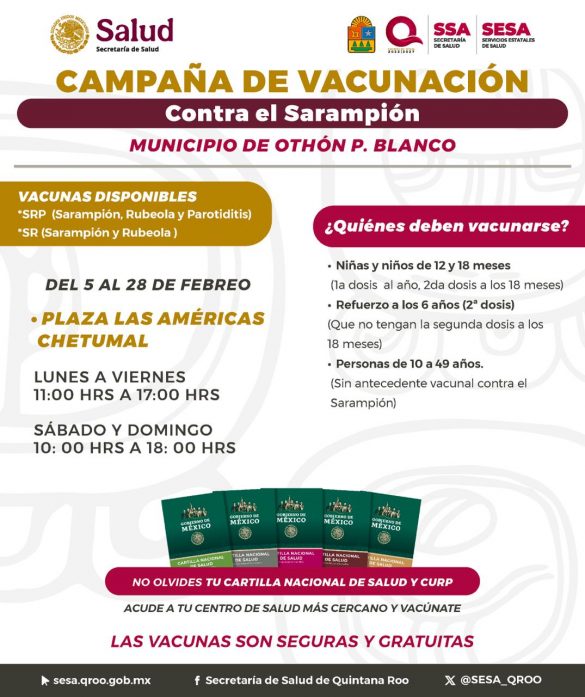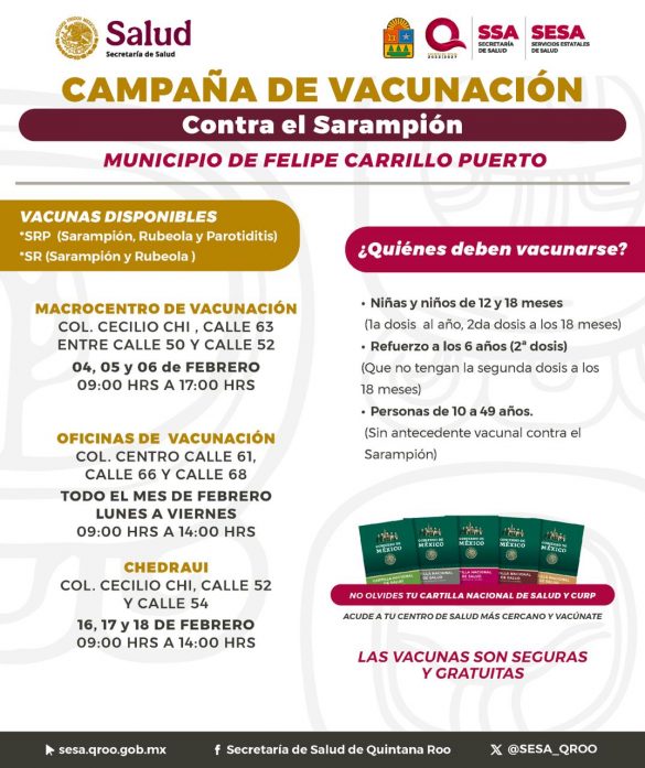 Chetumal.- En Quintana Roo, la salud preventiva es una prioridad permanente dentro del gobierno humanista que encabeza la gobernadora Mara Lezama Espinosa, por lo que a través de la Secretaría Estatal de Salud (SESA) se han fortalecido de manera oportuna acciones de vacunación como parte del Plan Nacional de Acción 2025-2026.