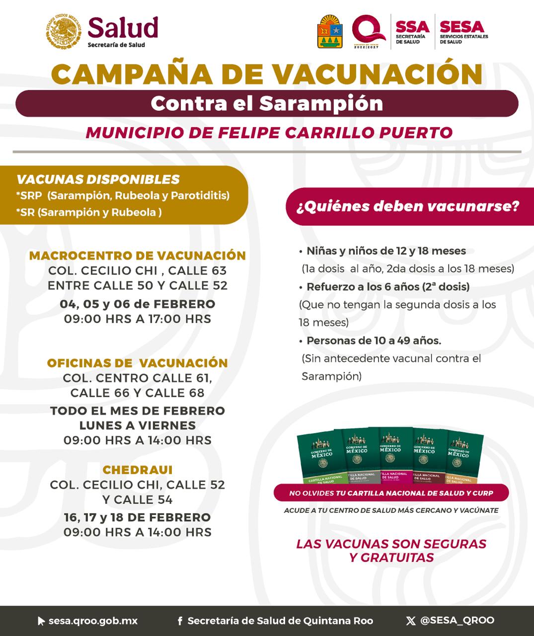 En el municipio de Felipe Carrillo Puerto, el Macrocentro de Vacunación opera en la colonia Cecilio Chi, en la calle 63 entre calles 50 y 52, los días 4, 5 y 6 de febrero, de 09:00 a 17:00 horas. De manera permanente durante el mes de febrero, las Oficinas de Vacunación ubicadas en la colonia Centro, en las calles 61, 66 y 68, brindan atención de lunes a viernes de 09:00 a 14:00 horas.