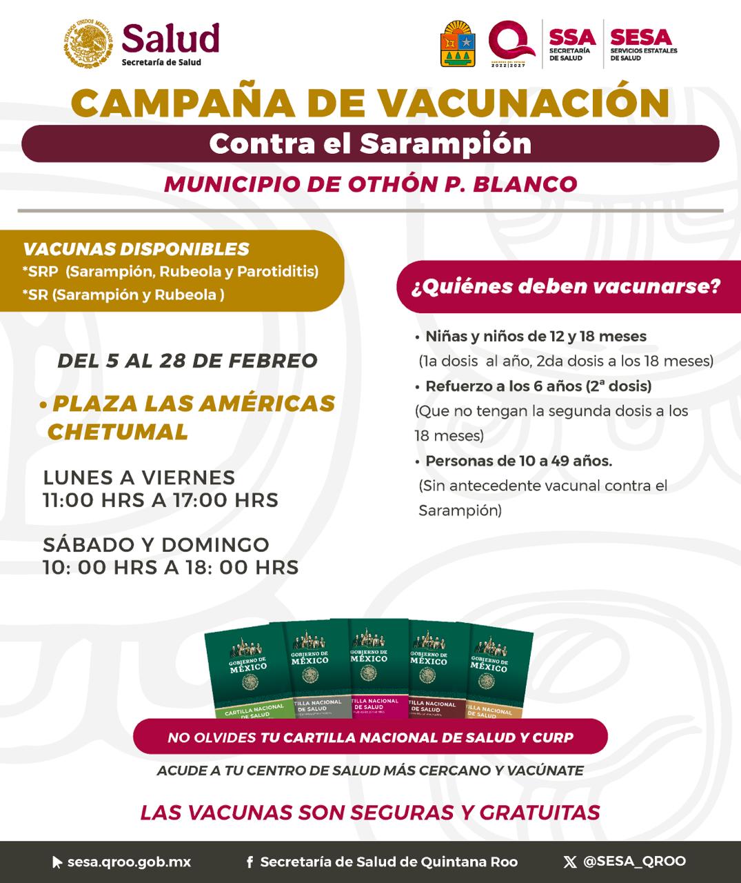 En el municipio de Othón P. Blanco, en la ciudad de Chetumal, el módulo de vacunación se encuentra instalado en Plaza Las Américas, del 5 al 28 de febrero, en un horario de lunes a viernes de 11:00 a 17:00 horas, y sábados y domingos de 10:00 a 18:00 horas.