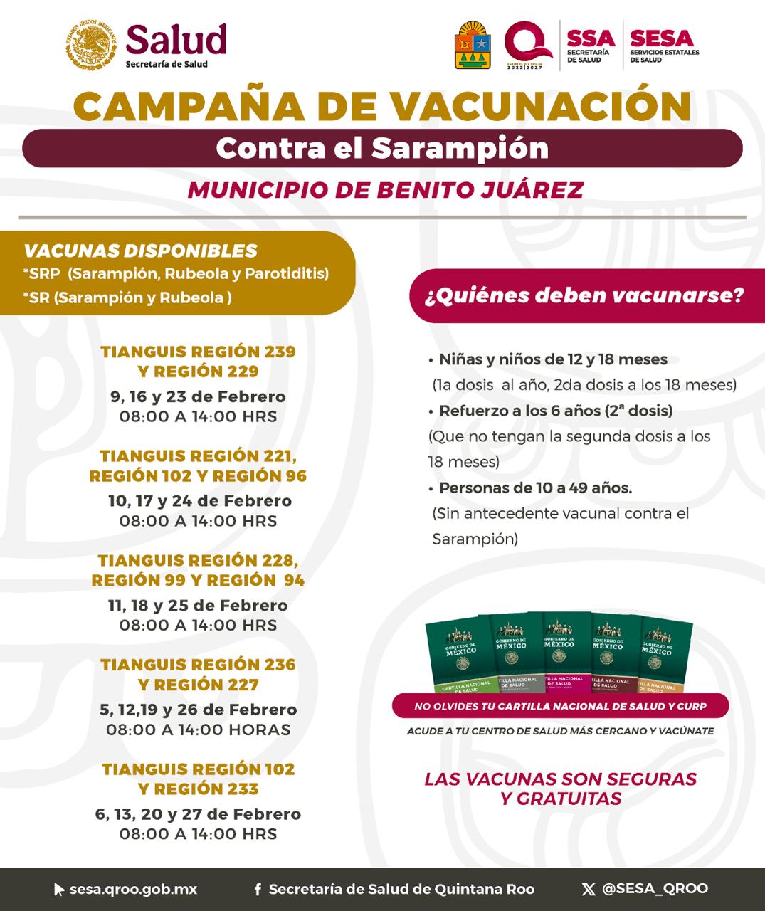 En el municipio de Benito Juárez, en Cancún, los módulos de vacunación se encuentran instalados en distintos tianguis de la ciudad, de 08:00 a 14:00 horas. Las jornadas se realizan los días 9, 16 y 23 de febrero en las regiones 239 y 229; los días 10, 17 y 24 de febrero en las regiones 221, 102 y 96; los días 11, 18 y 25 de febrero en las regiones 228, 99 y 94; los días 5, 12, 19 y 26 de febrero en las regiones 236 y 227; y los días 6, 13, 20 y 27 de febrero en las regiones 102 y 233.