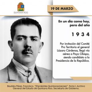 InicioVeda ElectoralEn un día como hoy, pero del año 1934 Por invitación del Comité Pro Territorio el general Lázaro Cárdenas, llegó vía aérea a Payo Obispo, siendo candidato a la Presidencia de la República.